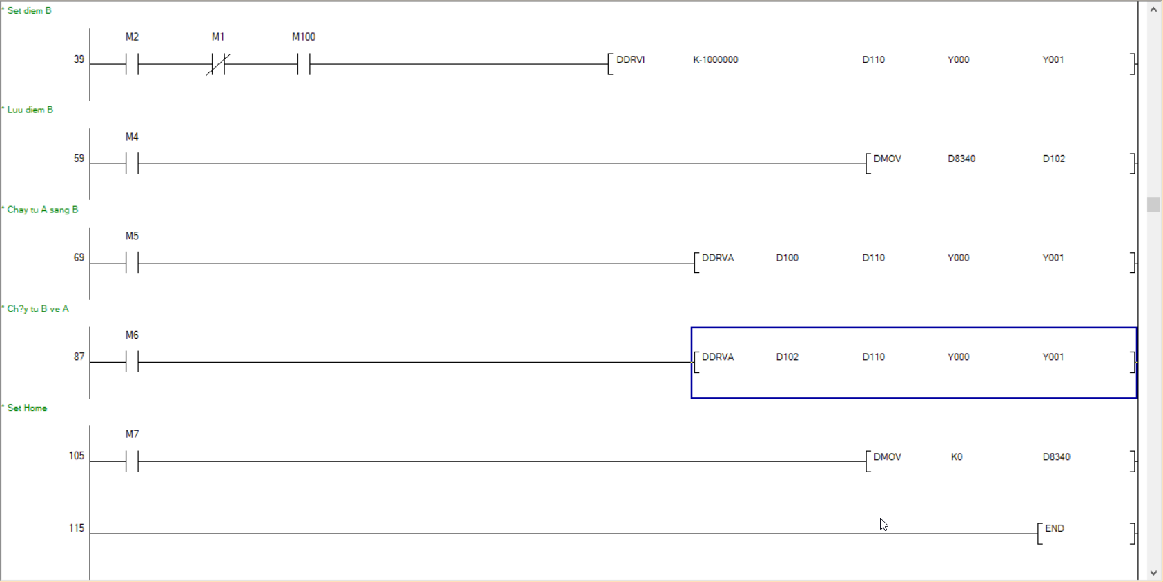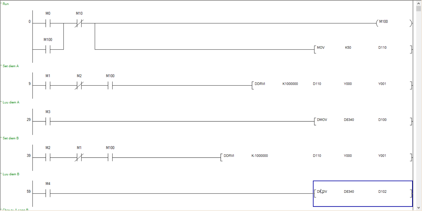 Dưới đây là đoạn mã mô phỏng quy trình chạy chính sử dụng lệnh DDRVA (Drive to Absolute – Chạy đến tọa độ tuyệt đối):